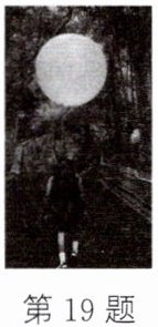 19. (7分)如图所示,一男子将一个氦气球用绳子拴在书包上爬山,在一定程度上实现了爬山减负。若该男子的质量为60kg,双脚站立时与地面的接触面积为$0.04m^2,$气球充气前的质量为0.1kg,充入氦气后体积为$2m^3($气球的厚度忽略不计),氦气密度取$0.18kg/m^3,$空气密度取$1.29kg/m^3,g$取10N/kg,求: