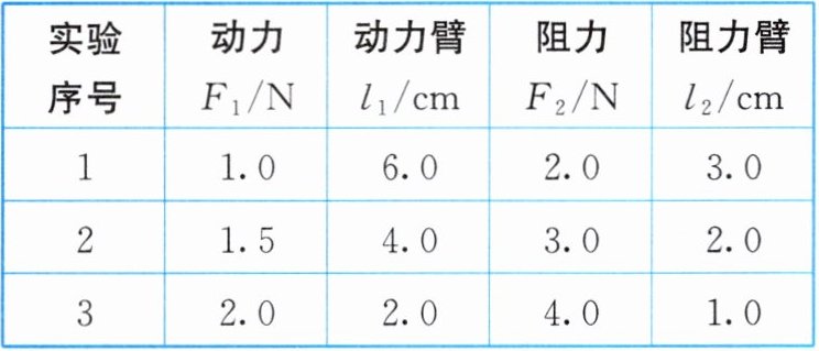 。|实验序号|动力$F_1/N$|动力臂$l_1/cm$|阻力$F_2/N$|阻力臂$l_2/cm$|