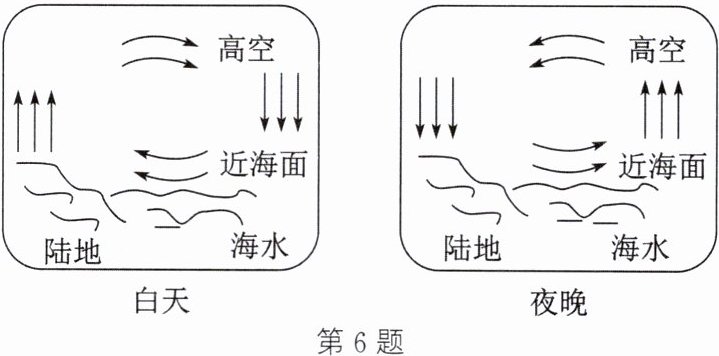 6. 炎炎夏日,小梅来到某海滨城市。她发现,在这里白天的风常常从海面吹向陆地,而每到夜晚,风却从陆地吹向海面。她利用学过的物理知识进行分析,并画出陆地和海面之间空气流动情况的示意图,如图所示。形成这一现象的主要原因是(