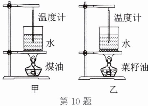 10. 小明和小辉学习了燃料的热值后,他们一起设计了一个实验来探究煤油和菜籽油的热值的大小关系。他们组装了如图甲和乙所示的装置进行实验,记录结果如表: