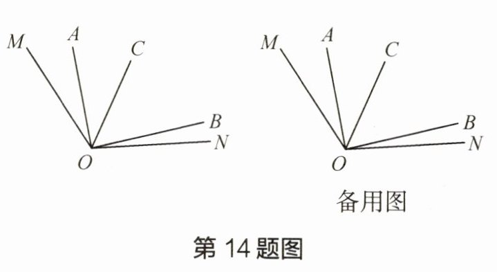 14 如图,已知 $ \angle MON = 120^{\circ} $,$ \angle AOC $ 与 $ \angle BOC $ 互余,$ OC $ 平分 $ \angle MOB $。
