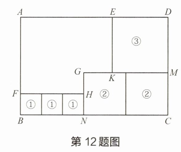 12 如图,用三种大小不等的正方形①②③和一个缺角的长方形拼成一个长方形 $ A B C D $(不重叠且没有缝隙),若 $ B F = a $,$ G H = a $,$ G K = a + 1 $。