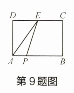 9 如图,在长方形ABCD中,$AB= 4cm$,$BC= 3cm$,$DE= EC$,动点P从点A出发,以每秒1cm的速度沿点$A→B→C→E$运动,最终到达点E。若点P运动的时间为t秒,则当$t= $____时,$S_{△APE}= 4cm^{2}$。