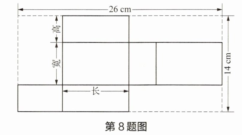 8 某产品的形状是长方体,长为8cm,它的展开图如图所示,则长方体的体积为____$cm^{3}$。