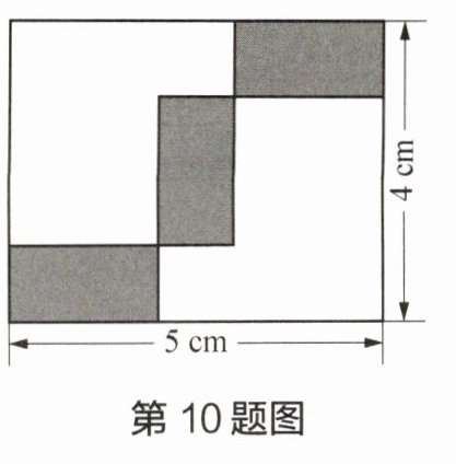 10 如图,将三个相同的长方形沿着“横一竖一横”的顺序排列在一个长和宽分别为 5 cm 和 4 cm 的长方形中,则图中空白部分的面积为 。