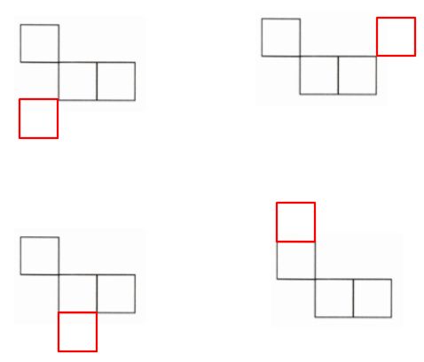 下面是由三个小正方形组成的图形,请你在图中补画一个小正方形,使补画后的图形为轴对称图形。试一试,有几种不同的画法?