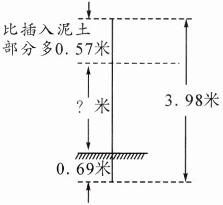 爸爸把一根长 3.98 米的竹竿竖直插到鱼塘中。竹竿插入泥土的部分是 0.69 米,露出水面的部分比插入泥土的部分多 0.57 米。请问这个鱼塘的水有多深?