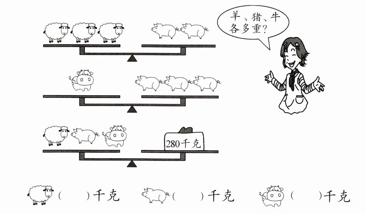 本题可通过设未知数,根据天平平衡建立等式关系,进而求解羊、猪、牛的重量。