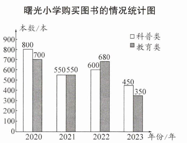 )本。2. 从2020年到2023年,科普类和教育类图书平均每年分别购买了多少本?