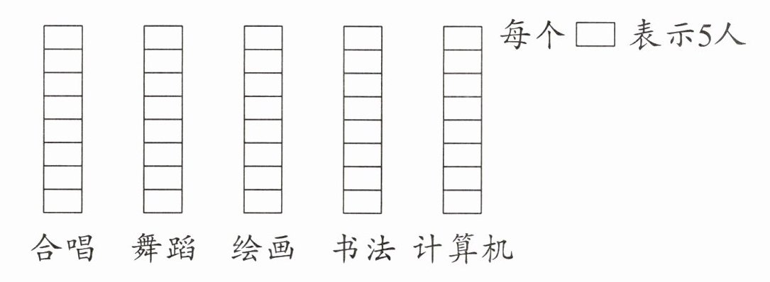 1. 合唱:$20÷5 = 4$(个),涂$4$个格;舞蹈:$25÷5 = 5$(个),涂$5$个格;绘画:$5÷5 = 1$(个),涂$1$个格;书法:$10÷5 = 2$(个),涂$2$个格;计算机:$40÷5 = 8$(个),涂$8$个格。