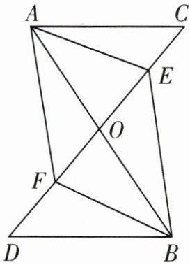 【解析】:本题主要考查平行四边形的判定,全等三角形的性质和判定以及平行线的性质。首先,根据平行线的性质,得到两对角相等,再加上一组对边相等($AO = BO$),利用$AAS$(角角边)判定$\triangle AOC$和$\triangle BOD$全等,从而得到$AC = BD$,$OC = OD$。然后,利用中点的性质,得到$OE = OF$。最后,根据平行四边形的判定条件(两组对边分别相等的四边形是平行四边形),证明四边形$AFBE$是平行四边形。