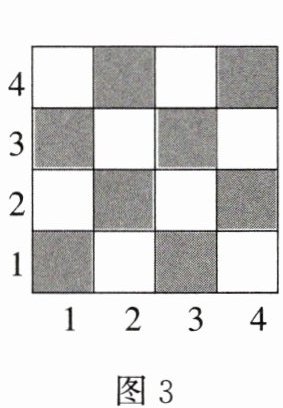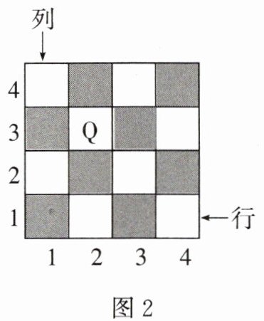 (2)在图3的棋盘中,可以在(1,1),(2,3),(3,4),(4,2)位置放置“后Q”,使这四个“后Q”之间互不受对方控制。(图略,在对应位置标出Q即可)。
