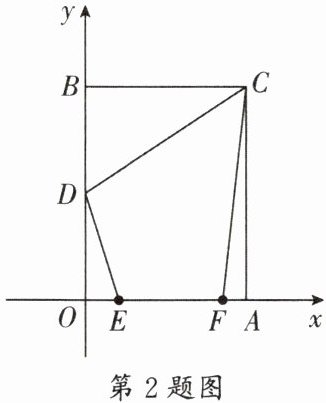 2. (嘉祥)如图,在平面直角坐标系中,长方形 $ OACB $ 的顶点 $ O $ 在坐标原点,顶点 $ A $,$ B $ 分别在 $ x $ 轴、$ y $ 轴的正半轴上,$ OA = 3 $,$ OB = 4 $,$ D $ 为边 $ OB $ 的中点。若 $ E $,$ F $ 为边 $ OA $ 上的两个动点,且 $ EF = 2 $,当四边形 $ CDEF $ 的周长最小时,点 $ F $ 的坐标为____。