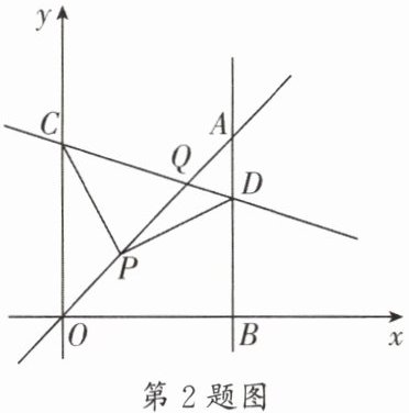 2. (金牛区期末)如图,在平面直角坐标系中,已知直线$y= x上一点P(2,2)$,$C为y$轴上一点,连接$PC$,线段$PC绕点P顺时针旋转90^{\circ}至线段PD$,过点$D作直线AB\perp x$轴,垂足为$B$,直线$AB与直线y= x交于点A$,连接$CD$,直线$CD与直线y= x交于点Q$.当$\triangle OPC\cong \triangle ADP$时,点$C$的坐标是____,点$Q$的坐标是____.