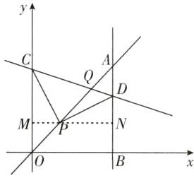 $(0,4 + 2\sqrt{2})$ $(2\sqrt{2}+2,2\sqrt{2}+2)$ [解析]如图,过点$P$作$x$轴的平行线交$y$轴于点$M$,交$AB$于点$N$。设$C(0,t)$。$\because P(2,2)$,$\therefore OP = 2\sqrt{2}$,$OM = BN = PM = 2$,$CM = t - 2$。$\because$线段$PC$绕点$P$顺时针旋转$90^{\circ}$至线段$PD$,$\therefore PC = PD$,$\angle CPD = 90^{\circ}$,$\therefore\angle CPM+\angle DPN = 90^{\circ}$,而$\angle CPM+\angle PCM = 90^{\circ}$,$\therefore\angle PCM=\angle DPN$。在$\triangle PCM$和$\triangle DPN$中,$\begin{cases}\angle PMC = \angle DNP,\\\angle PCM = \angle DPN,\\PC = DP,\end{cases}$$\therefore\triangle PCM\cong\triangle DPN$,$\therefore PN = CM = t - 2$,$DN = PM = 2$,$\therefore MN = t - 2 + 2 = t$,$DB = 2 + 2 = 4$,$\therefore D(t,4)$。$\because\triangle OPC\cong\triangle ADP$,$\therefore AD = OP = 2\sqrt{2}$,$\therefore A(t,4 + 2\sqrt{2})$。把$A(t,4 + 2\sqrt{2})$代入$y = x$,得$t = 4 + 2\sqrt{2}$,$\therefore C(0,4 + 2\sqrt{2})$,$D(4 + 2\sqrt{2},4)$。设直线$CD$的解析式为$y = kx + b$,把$C(0,4 + 2\sqrt{2})$,$D(4 + 2\sqrt{2},4)$代入,得$\begin{cases}b = 4 + 2\sqrt{2},\\(4 + 2\sqrt{2})k + b = 4,\end{cases}$解得$\begin{cases}k = 1-\sqrt{2},\\b = 4 + 2\sqrt{2},\end{cases}$$\therefore$直线$CD$的解析式为$y = (1-\sqrt{2})x + 4 + 2\sqrt{2}$。联立方程组$\begin{cases}y = x,\\y = (1-\sqrt{2})x + 4 + 2\sqrt{2},\end{cases}$解得$\begin{cases}x = 2\sqrt{2}+2,\\y = 2\sqrt{2}+2,\end{cases}$$\therefore Q(2\sqrt{2}+2,2\sqrt{2}+2)$。