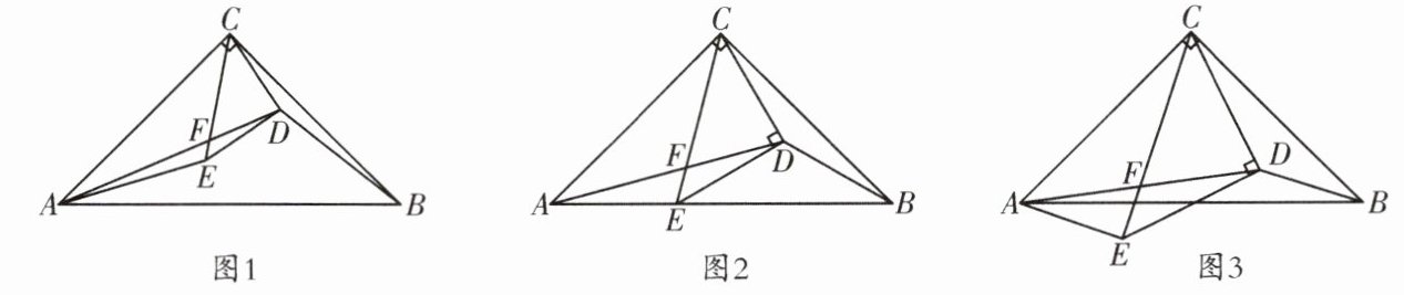 2. (双流区期末)如图 1,在 $Rt\triangle ABC$ 中,$\angle ACB = 90^{\circ}$,$AC = BC$,$D$ 为 $\triangle ABC$ 内部一点,$AD = AC$,连接 $DC$,将 $DC$ 绕点 $D$ 逆时针旋转 $90^{\circ}$ 得到 $DE$,连接 $CE$ 交 $AD$ 于点 $F$,连接 $AE$,$BD$。
