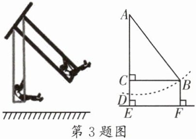 3. (武侯区期末)如图,一架秋千静止时,踏板离地的垂直高度$DE= 0.5m$,将它往前推送1.5m(水平距离$BC= 1.5m$)时,秋千的踏板离地的垂直高度$BF= 1m$,秋千的绳索始终拉直,则绳索AD的长是______m。