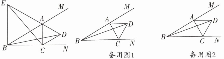 (2)如图1,过点$A$作$AH \perp BC$于点$H$,以$AB$为边在$AB$左侧作等边三角形$ABE$,连接$CE$。$\because AB = 4$,$\angle MAN = 30^{\circ}$,$\therefore AH = 2$,$BH = 2\sqrt{3}$。