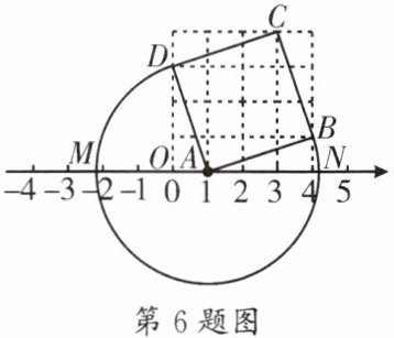 6. (西川)如图,数轴上点A所表示的数为1,点B,C,D是$4×4$的正方形网格上的格点,以点A为圆心,AD的长为半径画圆交数轴于M,N两点,则点M所表示的数为______.