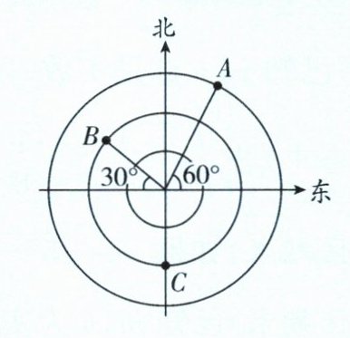 2. (实外西区)小明乘坐一艘游船出海游玩,游船上的雷达扫描探测得到的结果如图所示,每相邻两个圆之间的距离是1km(小圆的半径是1km),若小艇C在游船的正南方2km,则下列关于小艇A,B的位置描述,正确的是 (