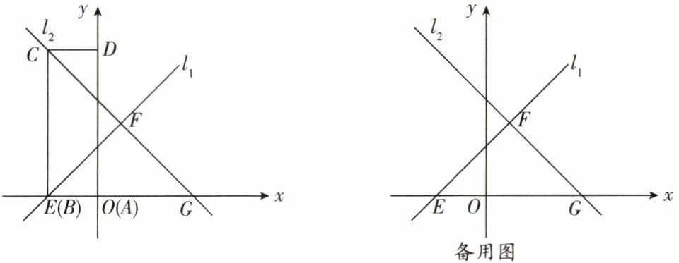 7. (武侯区期末)如图,已知直线$l_{1}:y = x + 2与直线l_{2}:y = - kx + 4(k \neq 0)相交于点F$,直线$l_{1}$,$l_{2}分别交x轴于点E$,$G$。长方形$ABCD的顶点C$,$D分别在直线l_{2}和y$轴上,顶点$A$,$B都在x$轴上,且点$B与点E$重合,点$A与点O$重合,长方形$ABCD的面积是12$。