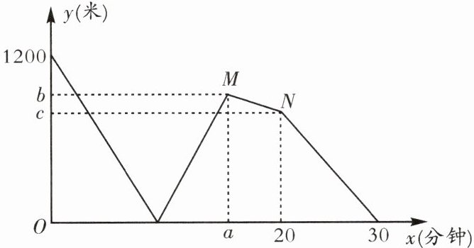 N表示乙到达A地,此时甲返回所走路程为$80×(20 - 15)=400$ (米),$\therefore$两人相距$1200 - 400=800$ (米),即$c=800$,$\therefore N(20,800)$。