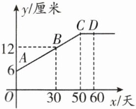 ∴线段AC所在直线的表达式为y=1/5x+6,故②正确.当x=40时,y=1/5×40+6=14,即第40天时该植物的高度为14厘米,故③正确.当x=50时,y=1/5×50+6=16,即第50天时该植物的高度为16厘米,故④错误.综上所述,正确的是①②③.