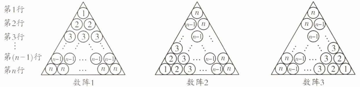 (1)$n^2$ $\frac{n(n+1)}{2}$ $1^2+2^2+3^2+\cdots+n^2$【解析】由所给数阵可知,$\underset{n个n}{\underbrace{n+n+\cdots+n}}=n^2$.数阵1中所有圆圈的个数之和为$1+2+3+\cdots+n=\frac{n(n+1)}{2}$.因为第1行圆圈中的数为1,即$1^2$;第2行两个圆圈中的数之和为2+2,即$2^2$;……;第n行n个圆圈中的数之和为$\underset{n个n}{\underbrace{n+n+n+\cdots+n}}$,即$n^2$,所以数阵1中所有圆圈中的数之和可以表示为$1^2+2^2+3^2+\cdots+n^2$.