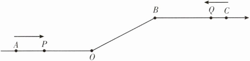 (3)如图,将这条数轴在原点$O和点B$处各折一下,得到一条“折线数轴”,我们称$A$,$C两点在折线数轴上的距离为AO$,$OB$,$BC$三段的和,动点$P从点A$出发,以每秒$2$个单位长度的速度沿着“折线数轴”的正方向运动,从点$O运动到点B$期间速度变为原来的一半,之后立刻恢复原速;同时,动点$Q从点C$出发,以每秒$1$个单位长度的速度沿着“折线数轴”的负方向运动,从点$B运动到点O$期间速度变为原来的两倍,之后也立刻恢复原速,点$P运动到点C$停止运动,点$Q运动到点A$停止运动.设运动时间为$t$秒.