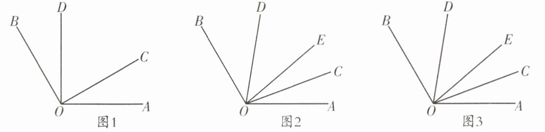 ②如图 3,设$∠AOC= α$,试判断$∠BOD与∠EOC$之间有何数量关系? 并说明理由.