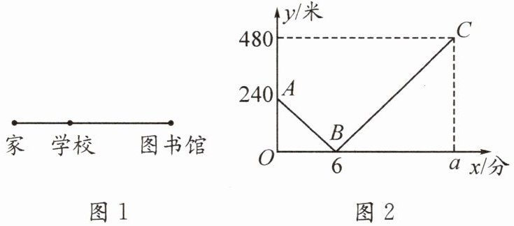 14. (2025·锦江)如图$1$所示,学校在小红家和图书馆之间,小红步行从家出发经过学校匀速前往图书馆.图$2是小红步行时离学校的路程y$(米)与行走时间$x$(分)之间的函数关系的图象.
