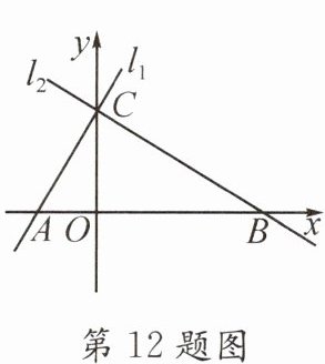 12. (2025·编写)如图,直线 $ l_1:y = 2x + 2 $ 分别交 $ x $ 轴、$ y $ 轴于 $ A,C $ 两点,直线 $ l_2:y = -\frac{1}{2}x + 2 $ 分别交 $ x $ 轴、$ y $ 轴于 $ B,C $ 两点,$ P(m,1) $ 是 $ \triangle ABC $ 内部(包括边界)的一点,则 $ m $ 的取值范围是
