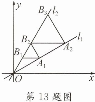 13. (2022·锦江)如图,直线 $ l_1 $ 的解析式为 $ y = \frac{\sqrt{3}}{3}x $,直线 $ l_2 $ 的解析式为 $ y = \sqrt{3}x $,$ B_1 $ 为 $ l_2 $ 上的一点,且点 $ B_1 $ 的坐标为 $ (1,\sqrt{3}) $,作直线 $ B_1A_1 // x $ 轴,交直线 $ l_1 $ 于点 $ A_1 $,再作 $ B_2A_1 \perp l_1 $ 于点 $ A_1 $,交直线 $ l_2 $ 于点 $ B_2 $,作 $ B_2A_2 // x $ 轴,交直线 $ l_1 $ 于点 $ A_2 $,再作 $ B_3A_2 \perp l_1 $,交直线 $ l_2 $ 于点 $ B_3 $,作 $ B_3A_3 // x $ 轴,交直线 $ l_1 $ 于点 $ A_3 … … $ 按此作法继续作下去,则点 $ A_1 $ 的坐标为