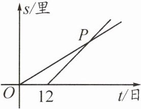 13. (2025·编写)元朝朱世杰的《算学启蒙》一书中记载:“今有良马日行二百四十里,驽马日行一百五十里. 驽马先行一十二日,问良马几何日追及之.”如图是两匹马行走的路程$s关于行走时间t$的函数图象,则两图象的交点$P$的坐标是