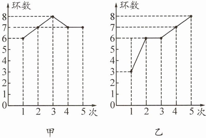 乙的平均数为 $\frac{3+6+6+7+8}{5}=6$(环),