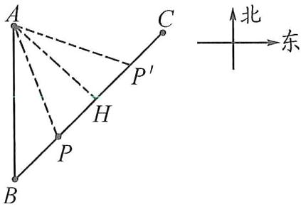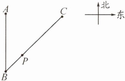 14. (2025·郫都)如图,在点B正北方的A处有一信号接收器($AB^{2}= 120^{2}×2cm^{2}$),点C在点B的北偏东45°的方向,一电子狗P从点B向点C的方向以4cm/s的速度运动并持续向四周发射信号,信号接收器接收信号的有效范围为150cm。