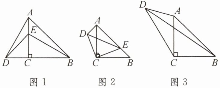 【探索证明】(2)如图2,将(1)中的△DCE绕点C按顺时针方向旋转,点E落在线段AB上,其他条件不变,此时∠DAB的度数是____,并探究线段CE,AE,BE之间的数量关系,并说明理由。