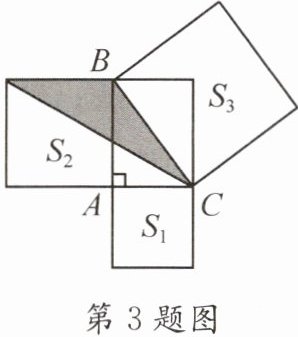 3. (2025·编写)如图,在Rt△ABC中,分别以这个三角形的三边为边向外侧作正方形、面积分别记为$S_1,S_2,S_3。$若$S_3 + S_2 - S_1 = 18,$则图中阴影部分的面积为______