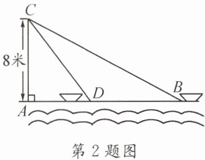 2. (2025·黔江)如图,在离水面高度为8米的岸上,有人用绳子拉船靠岸,开始时绳子BC的长为17米,几分钟后船到达点D的位置,此时绳子CD的长为10米,则船向岸边移动了