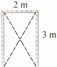 4. (1)(2025·编写)小亮家有一个高 $ 3 \mathrm { m } $、宽 $ 2 \mathrm { m } $ 的大门框(如图),为了防止其变形,他在对角线(图中虚线)的两端点间加固两根木条,则其中一根木条的长度为
