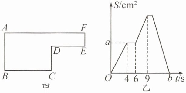 15. (2025·编写)已知动点$P以每秒2cm的速度沿图甲的边框按从B→C→D→E→F→A$的路径移动,相应的$\triangle ABP的面积S(cm^2)与时间t(s)$之间的关系如图乙中的图象所示。若$AB = 6cm$,试回答下列问题: