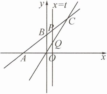 (2) 如图,一动直线 $ x = t $ 分别与两直线交于 $ P $, $ Q $ 两点,若 $ PQ = 2 $,求 $ t $ 的值。
