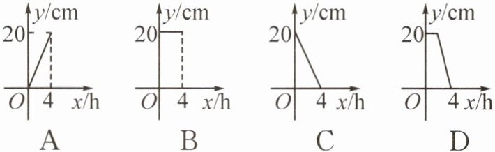 7. (2025·编写)一支蜡烛长$20\mathrm{cm}$,若点燃后每小时燃烧$5\mathrm{cm}$,则燃烧剩余的长度$y(\mathrm{cm})与燃烧时间x(\mathrm{h})$之间的函数关系的图象大致为(