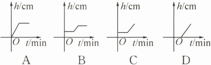6. (2025·编写)将一盛有部分水的圆柱形小水杯放入事先没有水的大圆柱形容器内,现用一注水管沿大容器内壁匀速注水(如图所示),则小水杯内水面的高度$h(\mathrm{cm})与注水时间t(\mathrm{min})$的函数图象大致为(