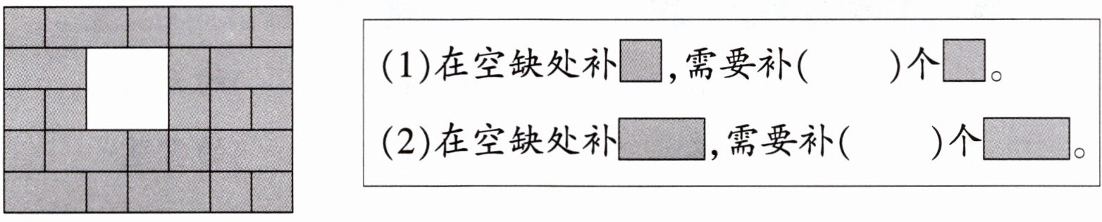 若补长方形,因为一个长方形相当于$2$个小正方形,空缺处是$4$个小正方形,$4÷2 = 2$,所以需要补$2$个长方形。