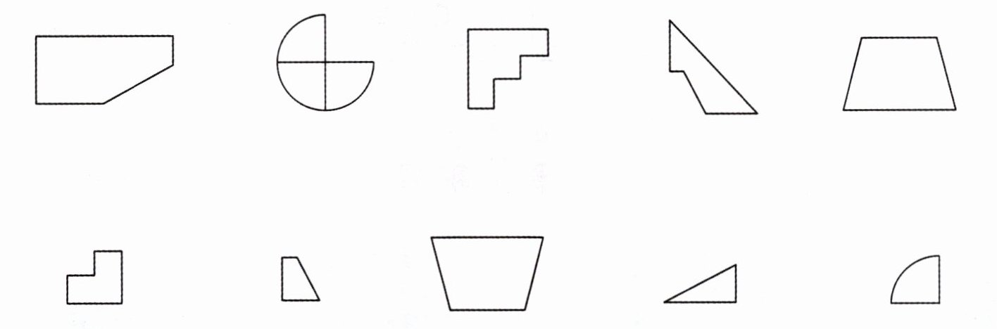 【解析】:通过观察图形的形状和特征,将能够拼成学过图形(如长方形、梯形、三角形、圆形等)的两块进行连线。例如第一行第一个类似梯形的图形和第二行第三个梯形形状互补可拼成梯形;第一行第二个缺四分之一圆的图形和第二行第五个四分之一圆可拼成圆形;第一行第三个图形和第二行第一个图形可拼成长方形;第一行第四个图形和第二行第四个三角形可拼成三角形;第一行第五个梯形和第二行第二个小梯形可拼成梯形。