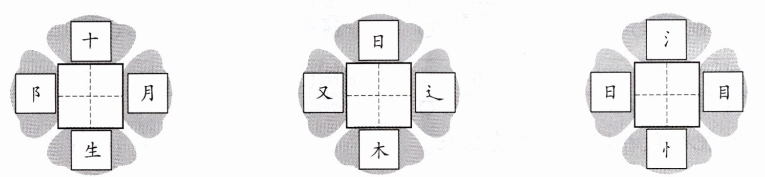 三在中间填入一个字,使它与花瓣上的偏旁都能组成新字。