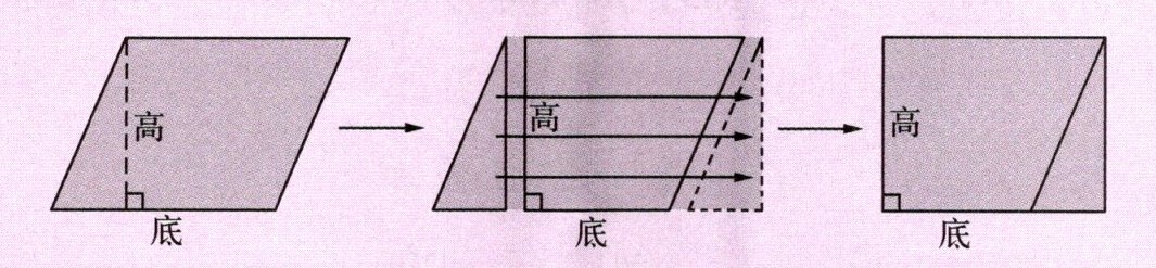 通过观察图形的平移发现,平移前后图形的形状和大小都没有发生变化,只是位置发生了改变。并且平行四边形通过平移可以转化为长方形,转化后的长方形的长等于平行四边形的底,长方形的宽等于平行四边形的高,长方形的面积等于平行四边形的面积,即$S = 底×高$($S = a× h$,$a$表示底,$h$表示高)。