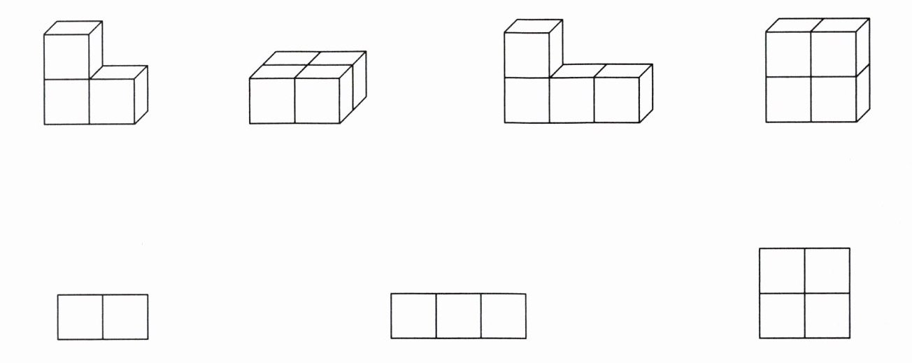 第三个立体图形(两层,底层三个正方体并排,上层一个正方体在左边)与“三个并排的正方形($□□□$)”相连;