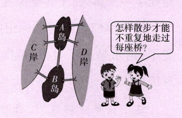 18世纪初普鲁士的哥尼斯堡,有一条河穿过,河上有两个小岛,有七座桥把两个岛与河岸连接起来(如图)。有个人提出一个问题:一个步行者怎样才能不重复、不遗漏地一次走完七座桥,最后回到出发点。